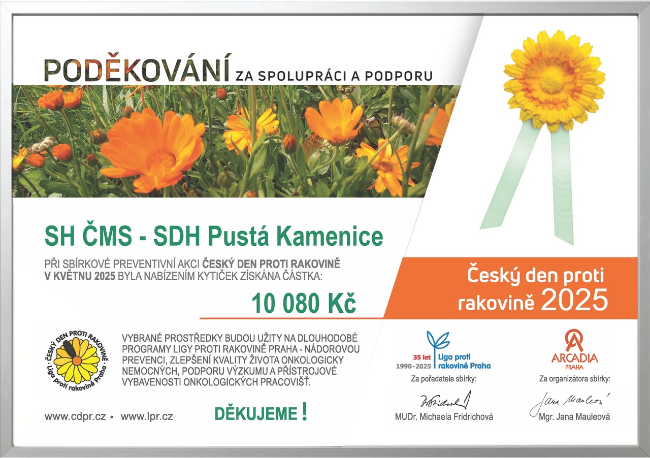 Ve středu 14.5. jsme se opět po roce zapojili do celonárodní sbírky Ligy proti rakovině. Skupinky dětí za doprovodu dospělých členů našeho sboru se vydaly po obci, aby prodávaly kytičku měsíčku lékařského, která se stala symbolem této dobročinné akce. Děkujeme všem spoluobčanům za vstřícnost a za štědré finanční dary. V letošní sbírce se nám podařilo v naší obci vybrat zatím rekordní částku, která přesáhla 10000Kč.