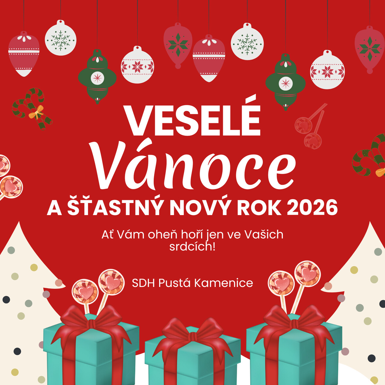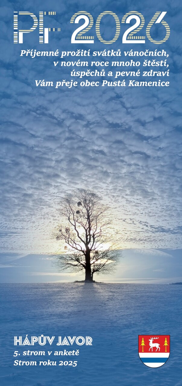Vážení spoluobčané, chataři, chalupáři, vážení návštěvníci pustokamenických webových stránek. Za obec Pustá Kamenice Vám přejeme příjemné prožití vánočních svátků a šťastný nový rok. Krásné prožití vánočních svátků a pevné zdraví v novém roce Vám také přejí ze ZŠ a MŠ, knihovny, klubu seniorek, Tělovýchovné jednoty a Sboru dobrovolných hasičů Pustá Kamenice - viz. přiložená PF 2026.